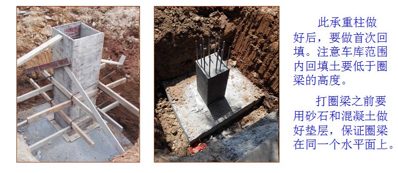 此承重柱連接承臺和地面圈梁,注意首次澆筑混凝土,要預留出大于車庫立柱預埋件底腳高度的鋼筋,以方便預埋件的調(diào)整和固定。